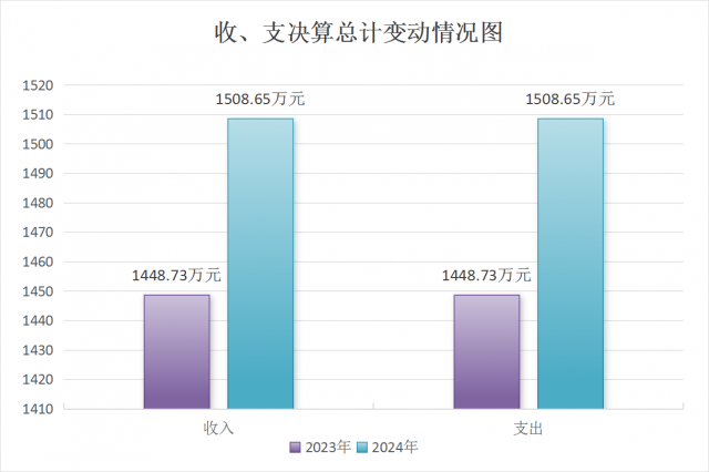 2024年度收入、支出总计为1508.65万元。与2023年度相比,收入、支出总计各增加59.92万元,增长4.14%。主要变动原因是人员类支出随着社会经济的发展同步自然增长。