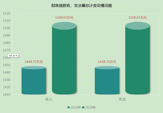 2024年度财政拨款收入、支出总计均为1508.65万元。与2023年度相比,财政拨款收入总计、支出总计各增加59.92万元,增长4.14%。主要变动原因是人员类支出随着社会经济的发展同步自然增长。