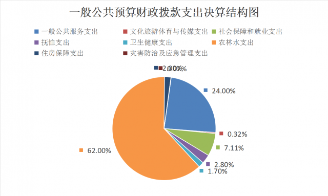 2024年度一般公共预算财政拨款支出1423.65万元,主要用于以下方面:一般公共服务支出354.57万元,占24.00%;文化旅游体育与传媒支出4.5万元,占0.32%;社会保障和就业支出107.84万元,占7.11%;抚恤支出41.07万元,占2.80%;卫生健康支出24.46万元,占1.70%;农林水支出894.49万元,占62.00%;住房保障支出36.8万元,占2.00%;灾害防治及应急管理支出1万元,占0.07%(注:仅罗列本部门涉及的全部功能分类科目,至类级)