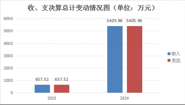 2024年度收、支总计均为5405.96万元。与2023年度657.52万元相比,收、支总计各增加4748.44万元,增长722.17%。主要变动原因是新建分园增大投入。