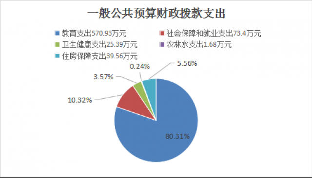 2024年度一般公共预算财政拨款支出710.96万元,主要用于以下方面:一般公共服务支出0万元,占0%;教育支出570.93万元,占80.3%;科学技术支出0万元,占0%;文化旅游体育与传媒支出0万元,占0%;社会保障和就业支出73.40万元,占10.32%;卫生健康支出25.39万元,占3.57%;农林水支出1.68万元,占0.24%住房保障支出39.56万元,占5.56%。