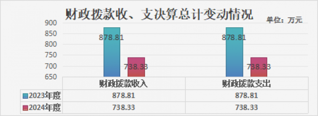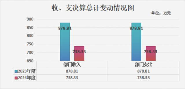 2024年度收、支总计均为738.33万元。与2023年度相比,收、支总计各减少140.48万元,下降了15.98%。主要变动原因是项目减少支出等。
