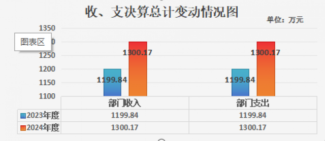 2024年度收、支总计均为1300.17万元。与2023年度相比,收、支总计各增加100.33万元,增幅8.36%。主要变动原因是教育支出增加。
