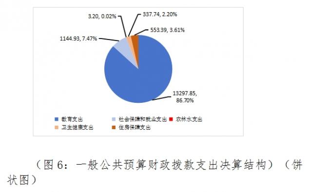 2024年度一般公共预算财政拨款支出15337.11万元,主要用于以下方面:一般公共服务支出0万元,占0%;教育支出13297.85万元,占86.70%;科学技术支出0万元,占0%;文化旅游体育与传媒支出0万元,占0%;社会保障和就业支出7.47万元,占7.47%;农林水支出3.20万元,占0.02%;卫生健康支出337.74万元,占2.20%;住房保障支出553.39万元,占3.61%。