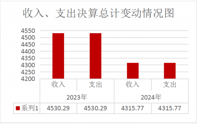 2024年度收、支总计均为4315.77万元。与2023年度相比,收、支总计各减少214.52万元,减少4.7%。