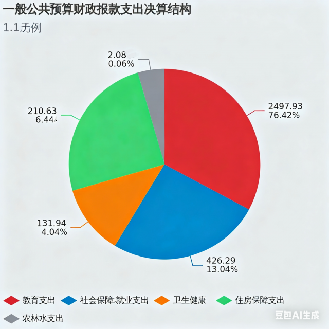 2024年度一般公共预算财政拨款支出3268.87万元,主要用于以下方面:一般公共服务支出0万元,占0%;教育支出2497.93万元,占76.42%;科学技术支出0万元,占0%;文化旅游体育与传媒支出0万元,占0%;社会保障和就业支出426.29万元,占13.04%;卫生健康支出131.94万元,占4.04%;住房保障支出210.63万元,占6.44%;农林水支出2.08万元,占0.06%。