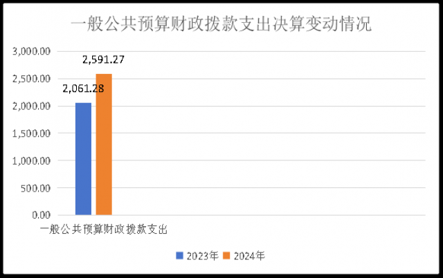 2024年一般公共预算财政拨款支出2591.27万元,占本年支出合计的84.61%。与2023年相比,一般公共预算财政拨款支出增加529.99万元,增长25.71%。主要变动原因是原渠县临巴镇第二小学并入人员经费增加。