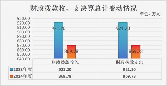 2024年度收、支总计均为869.78万元。与2023年度相比,收、支总计各减少51.42万元,减少5.58%。主要变动原因是项目金额减少。
