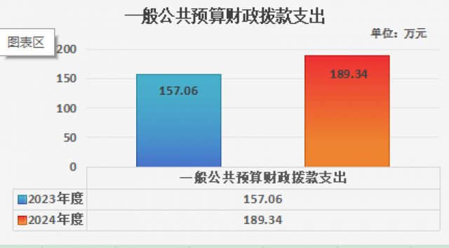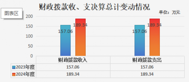 2024年度财政拨款收、支总计均为189.34万元。与2023年度相比,财政拨款收、支总计各增加32.28万元,增加了20.55%。主要变动原因是人员经费增加。