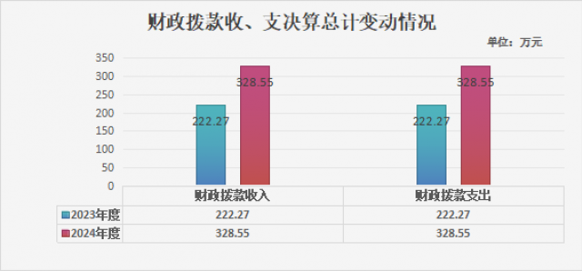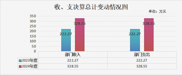 2024年度收、支总计各328.55万元。与2023年相比,收、支总计各增加106.28万元,增加47.82%。主要变动原因是所有聘用教职工(非在编)的薪酬、全园幼儿的保教活动、食材采购等所有运营成本。