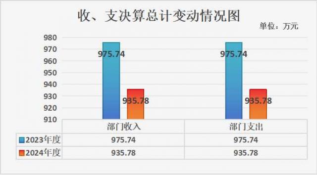 2024年度收、支总计均为935.78万元。与2023年度相比,收、支总计各减少39.96万元,降幅为4.1%。主要变动原因是教师调出及相应五险一金预算减少。