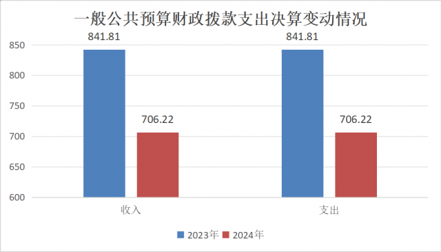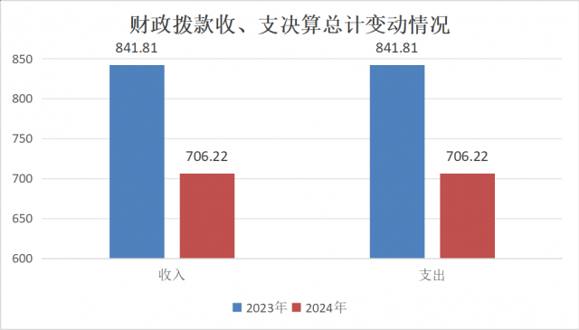 2024年度收、支总计均为706.22万元。与2023年度相比,收、支总计各减少135.59万元,减少16.10%。主要变动原因是人员减少。
