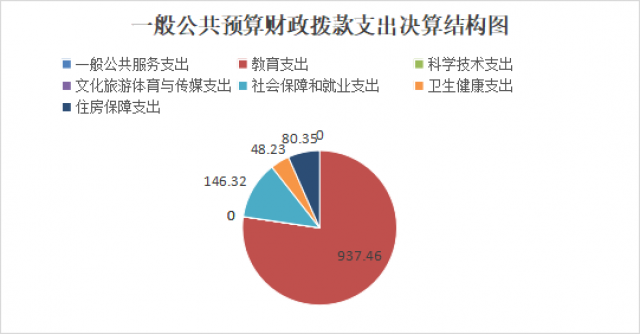 2024年度一般公共预算财政拨款支出1212.36万元,主要用于以下方面:一般公共服务支出0万元,占0%;教育支出937.46万元,占77.33%;科学技术支出0万元,占0%;文化旅游体育与传媒支出0万元,占0%;社会保障和就业支出146.32万元,占12.07%;卫生健康支出48.23万元,占3.98%;住房保障支出80.35万元,占6.62%。