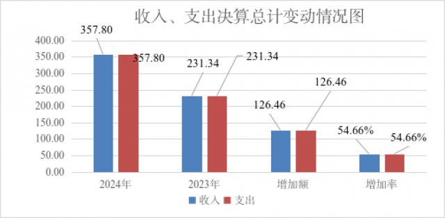 2024年度收入、支出总计均为357.8万元。与2023年度相比,收入、支出总计均增加126.46万元,增长54.66%。主要变动原因是本年新增预算用于偿付以前年度为缴纳西部计划志愿者社保在财政的借款(此次以“专项运转类经费”名义追加),以及新增2024年五四青年节活动费用。