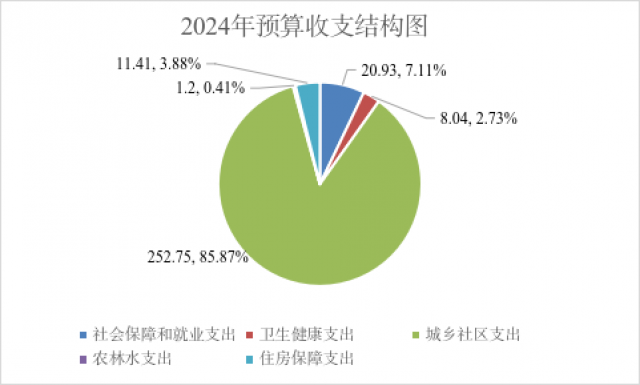 2024年度一般公共预算财政拨款支出294.33万元,主要用于以下方面:城乡社区支出252.75万元,占85.87%;农林水支出1.2万元,占0.41%;社会保障和就业支出20.93万元,占7.11%;卫生健康支出8.04万元,占2.73%;住房保障支出11.41万元,占3.88%。(注:仅罗列本部门涉及的全部功能分类科目,至类级)