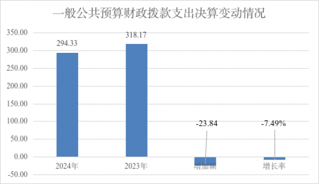 2024年度一般公共预算财政拨款支出294.33万元,占本年支出合计的100%。与2023年度相比,一般公共预算财政拨款支出减少23.84万元,下降7.49%。主要变动原因是2024年新区发展工作经费在上年基础上进行了压减