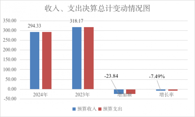 2024年度收入、支出总计均为294.33万元。与2023年度相比,收入、支出总计均减少23.84万元,下降7.49%。主要变动原因是2024年新区发展工作经费在上年基础上进行了压减。