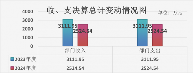 2024年度财政拨款收、支总计均为2524.54万元。与2023年度相比,财政拨款收、支总计各减少587.41万元,减少18.86%。主要变动原因是人员减少及教育资金项目减少。