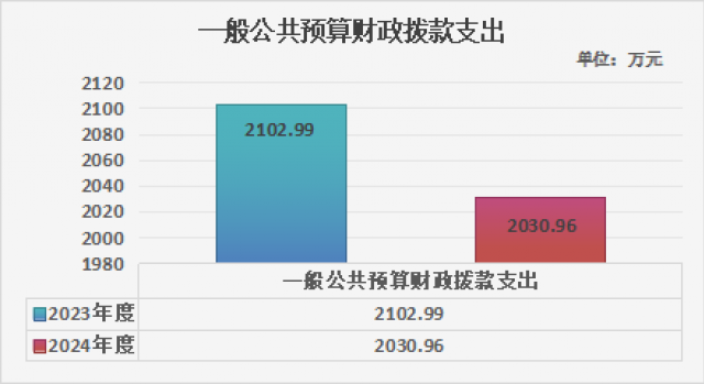 2024年一般公共预算财政拨款支出2030.96万元,占本年支出合计的100.00%。与2023相比,一般公共预算财政拨款减少72.03万元,减少3.42%。主要变动原因是人员减少。