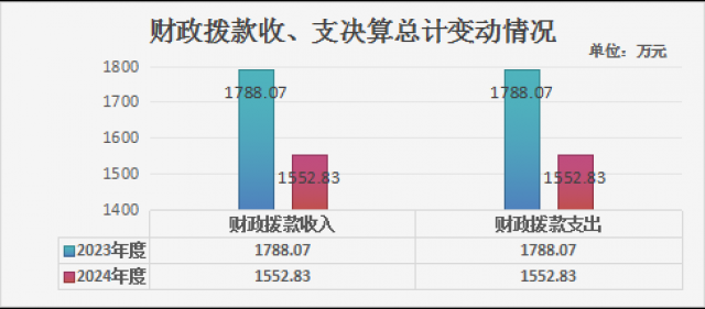 2024年度财政拨款收、支总计均为1552.83万元。与2023年度收、支总计1788.07万元相比,财政拨款收、支总计各减少235.24万元,下降13.16%。主要变动原因是由于在职人员减少导致的工资福利支出下降,以及无政府性基金预算财政拨款收入。