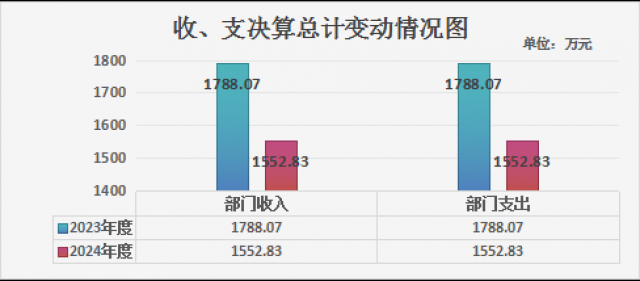 2024年度收入与支出总计均为1552.83万元。与2023年度收入与支出1788.07万元相比,一般公共预算支出减少185.24万元,政府性基金预算减少50万元(本年无此项收入),收、支总计减少235.24万元,下降13.16%。主要变动原因是由于在职人员减少导致的工资福利支出下降,以及无政府性基金预算财政拨款收入。