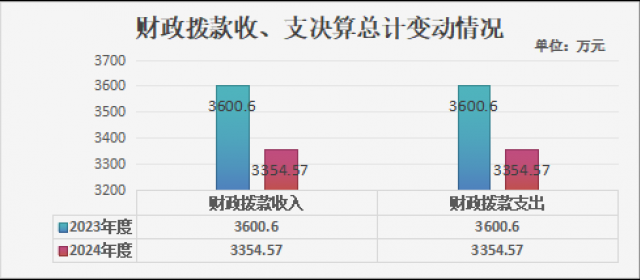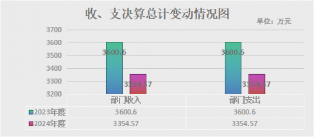 2024年度收、支总计均为3354.57万元。与2023年度相比,收、支总计各减少246.03万元,减少6.83%。主要变动原因是人员退休、人员调出及项目预算整体收入减少。