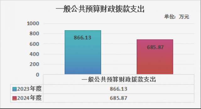 2024年度一般公共预算财政拨款支出685.87万元,占本年支出合计的97.87%。与2023年度相比,一般公共预算财政拨款支出减少180.26万元,减少20.81%。主要变动原因是人员减少等。