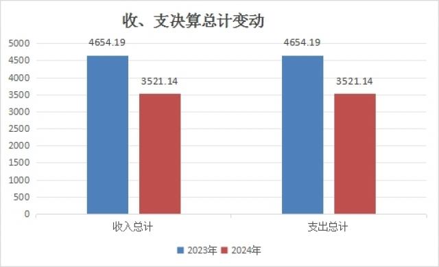2024年度收、支总计均为3521.14万元。与2023年度相比,一般公共预算支出减少1606.79万元,政府基金预算支出增加473.74万元,二者相抵后,总体支出减少1133.05万元,收、支减少24.34%。主要变动原因是2024年与2023年相比,有食堂综合楼建设等项目资金减少,教师退休和教师调出后人员经费减少等。