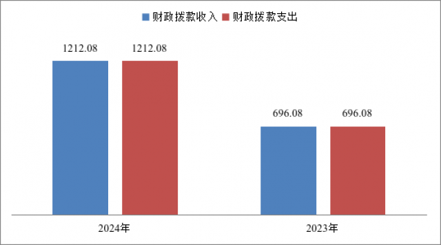 2024年度财政拨款收入、支出总计均为1212.08万元(不含其他收入13.70万元)。与2023年度相比,财政拨款收入、支出总计各增加516万元,增长74.14%。主要变动原因是政府性基金预算收入的增加。
