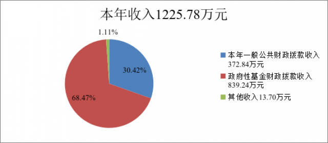 2024年度本年收入合计1225.78万元,其中:一般公共预算财政拨款收入372.84万元,占30.42%;政府性基金预算财政拨款收入839.24万元,占68.47%;国有资本经营预算财政拨款收入0万元,占0%;上级补助收入0万元,占0%;事业收入0万元,占0%;经营收入0万元,占0%;附属单位上缴收入0万元,占0%;其他收入13.70万元,占1.12%。