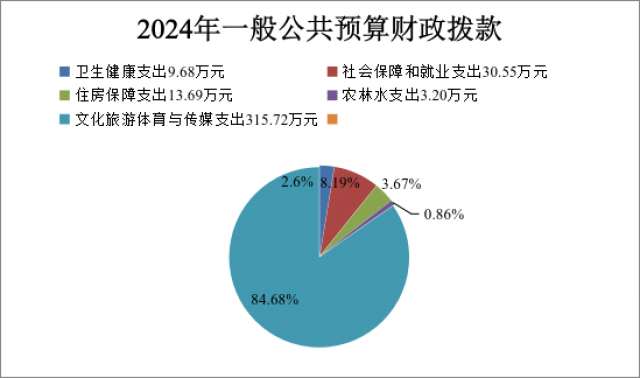 2024年度一般公共预算财政拨款支出372.84万元,主要用于以下方面:一般公共服务支出0万元,占0%;教育支出0万元,占0%;科学技术支出0万元,占0%;文化旅游体育与传媒支出315.72万元,占84.68%;社会保障和就业支出30.55万元,占8.19%;卫生健康支出9.68万元,占2.60%;住房保障支出13.69万元,占3.67%;农林水支出3.20万元,占0.86%。