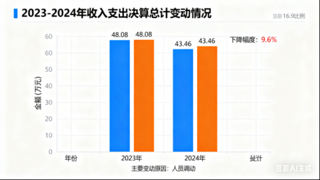2024年度收入、支出总计均为43.46万元。与2023年度相比,收入、支出总计各减少4.62万元,下降9.6%。主要变动原因是人员调动。
