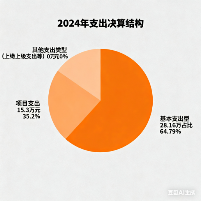 2024年度本年支出合计43.46万元,其中:基本支出28.16万元,占64.79%;项目支出15.3万元,占35.2%;上缴上级支出0万元,占0%;经营支出0万元,占0%;对附属单位补助支出0万元,占0%。