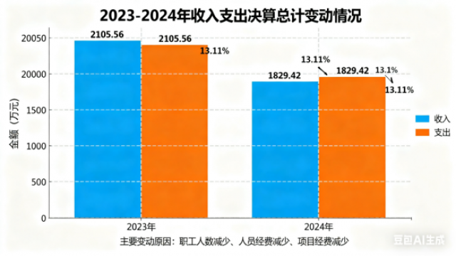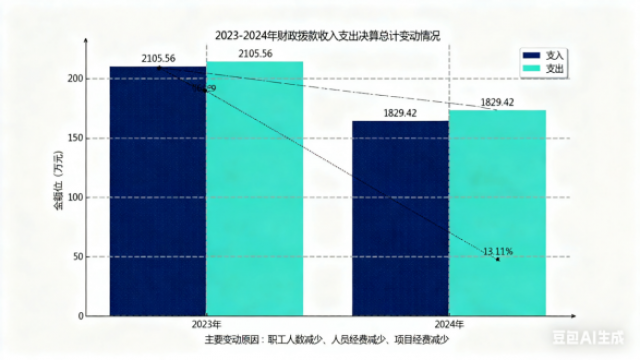 2024年度财政拨款收入、支出总计均为1829.42万元。与2023年度相比,财政拨款收入总计、支出总计各减少276.14万元,下降13.11%。主要变动原因是职工人数减少、人员经费减少、项目经费减少。