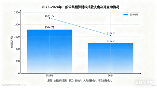 2024年度一般公共预算财政拨款支出1312.7万元,占本年支出合计的71.75%。与2023年度相比,一般公共预算财政拨款支出减少232.02万元,下降15.02%。主要变动原因是职工人数减少、人员经费减少、项目经费减少。