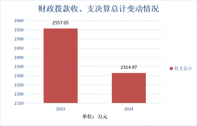 2024年度财政拨款收入、支出总计均为2,314.97万元。与2023年度相比,财政拨款收入、支出总计各减少242.07万元,下降9.5%。