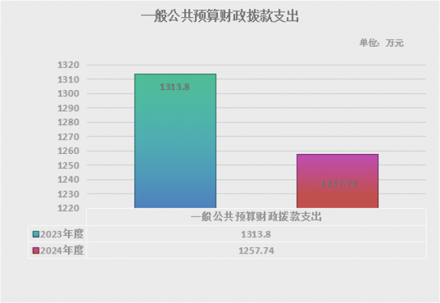 2024年度一般公共预算财政拨款支出1257.74万元,占本年支出合计的100%。与2023年度相比,一般公共预算财政拨款支出减少56.06万元,下降4.27%。主要下降原因是学校项目经费减少,财政拨付人员经费减少。