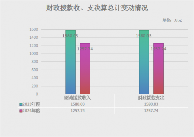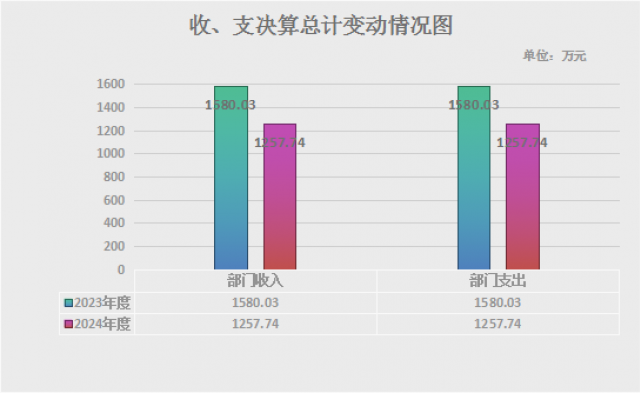 2024年度收、支总计均为1257.74万元。与2023年度相比,收、支总计各减少322.29万元,下降20.40%。主要下降原因是学校项目经费减少,财政拨付人员经费减少。
