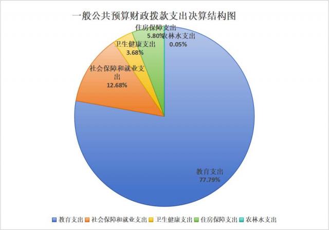 2024年度一般公共预算财政拨款支出决算2341.02万元,主要用于以下方面:教育支出1821.17万元,占77.79%;科学技术支出0万元,占0%;文化旅游体育与传媒支出0万元,占0%;社会保障和就业支出296.75万元,占12.68%;卫生健康支出86.12万元,占3.68%;住房保障支出135.77万元,占5.8%;农林水支出1.21万元,占0.05%。