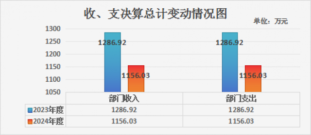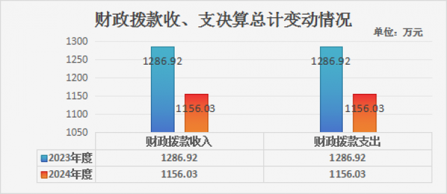 2024年度收、支总计均为1,156.03万元。与2023年度相比,收、支总计各减少130.89万元,降低11.32%。主要变动原因是学校项目经费减少,财政拨付人员经费减少。