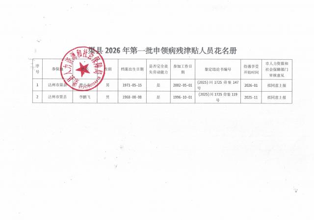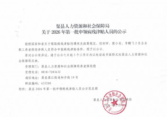 渠县人力资源和社会保障局关于2026年第一批申领病残津贴人员的公示