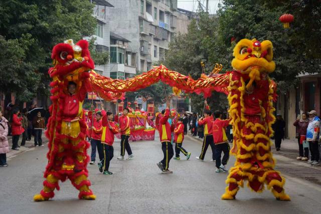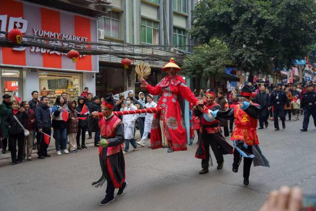 下午3点,“賨艺千年·非遗流芳”民俗巡演活动率先开场。涌兴镇街道两旁早已挤满翘首以待的群众。舞狮、车车灯、花花船、渔翁得利、威风锣鼓等节目沿街巡演,气氛热烈。街道两旁的观众纷纷拿起手机拍照记录,定格下美轮美奂的民俗倩影。