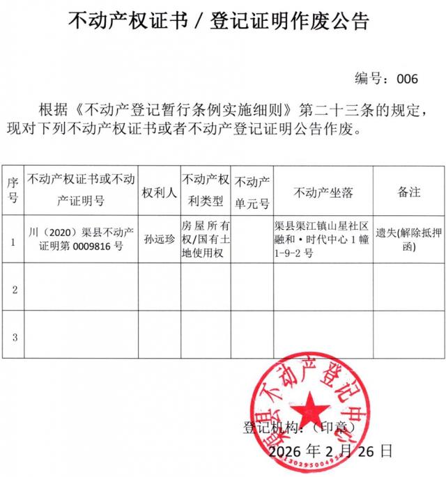 不动产证明注销登记公告