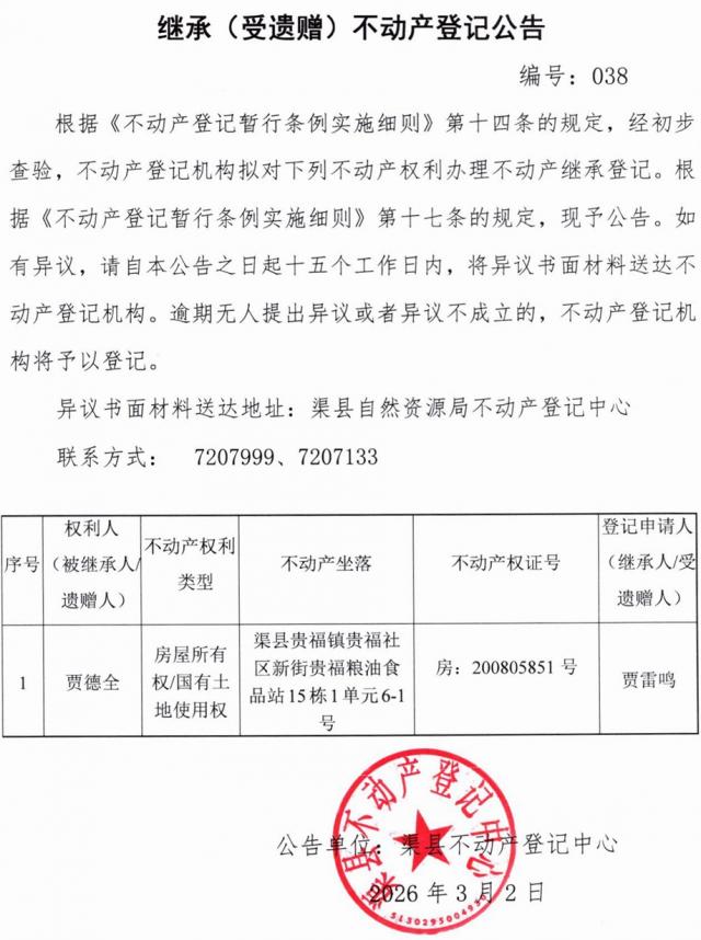 不动产权利继承登记公告--贾雷鸣