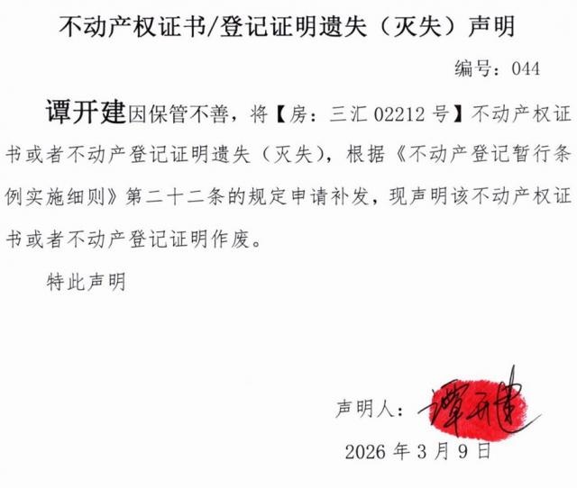 不动产权证书遗失登记公告--谭开建