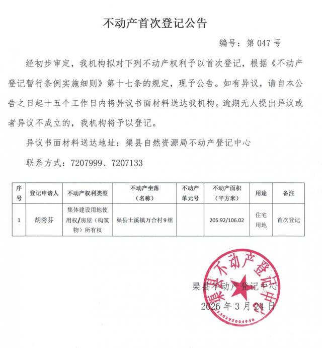 不动产权利首次登记公告--胡秀芬