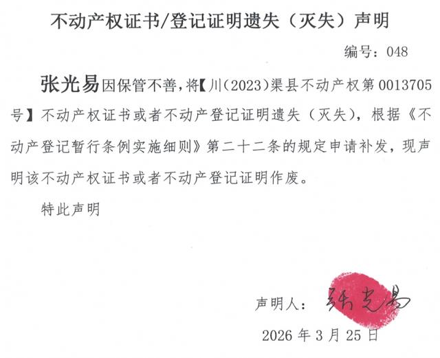 不动产权证书遗失登记公告--张光易