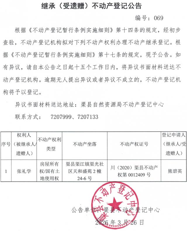 不动产权利继承登记公告--熊碧英