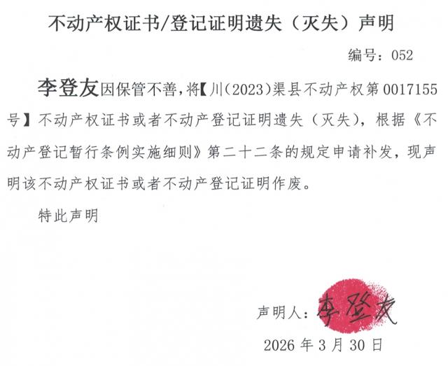 不动产权证书遗失登记公告--李登友