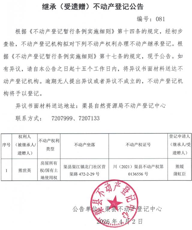 不动产权利继承登记公告--熊媛、蒲虹臣